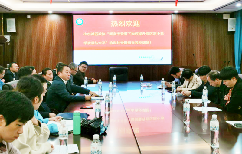 随后,阳新华校长和雷庆建副校长在会议室对学校的高中的教学教育情况等工作进行了详细汇报。调研组围绕“新高考背景下如何提升我区高中教育教学质量与水平”展开了深入探讨,教育科技界别的领导和专家就我区高中教育教学现状和存在的问题,给我们提出了宝贵的意见。
