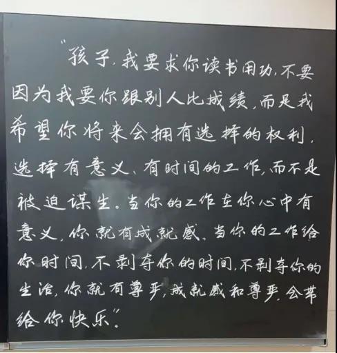 她在黑板上把龙应台写给安德烈的那段话写了下来送给了班上的学生,“孩子,我要求你读书用功,不是因为我要你跟别人比成绩,而是,我希望你将来会拥有选择的权利,选择有意义、有时间的工作,而不是被迫谋生。当你的工作在你心中有意义,你就有成就感。当你的工作给你时间,不剥夺你的生活,你就有尊严。成就感和尊严,会带给你快乐。这就是学习的意义!